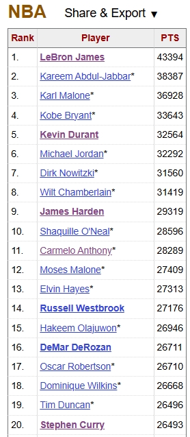 就此,库里的NBA生涯得分来到了26501分,超越了马刺传奇蒂姆·邓肯(26496),升至NBA历史得分总榜第19位!